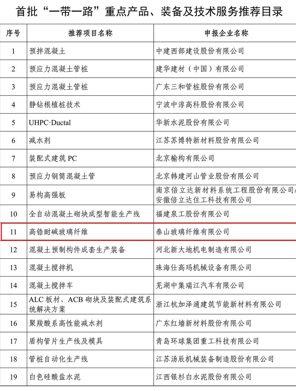 - 泰山玻纤耐碱纤维入选首批《 “一带一路”重点产品、装备及技术服务推荐目录》