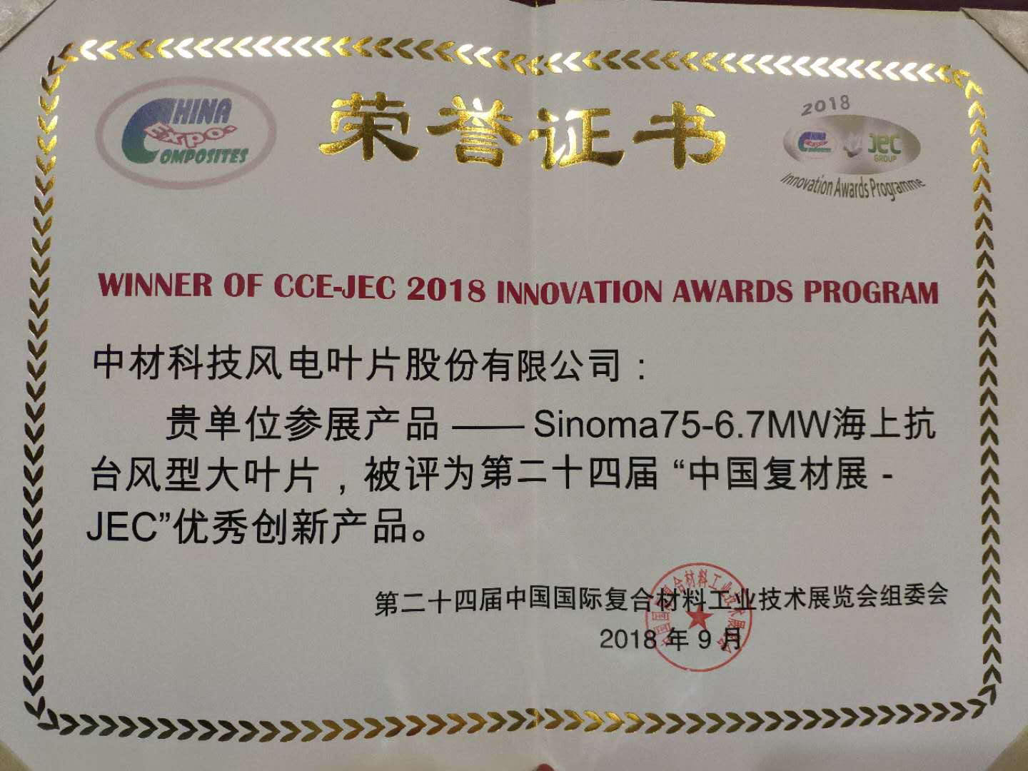9月5日上午11点,在2号展馆新闻发布区进行2018CCE-JEC创新产品颁奖仪式,来自国内外33家企业的42件创新产品角逐原材料、应用、工艺与技术三大类十余项大奖。心博(中国)XINBO·官方网页版风电叶片股份有限公司的参展产品“75-6.7MW海上抗台风型大叶片”、北京中材汽车复合材料有限公司参展产品“大马力柴油发动机复合材料油底壳”两项产品评为第二十四届“中国复材展-JEC”优秀创新产品奖。公司董事长薛忠民参加颁奖仪式。