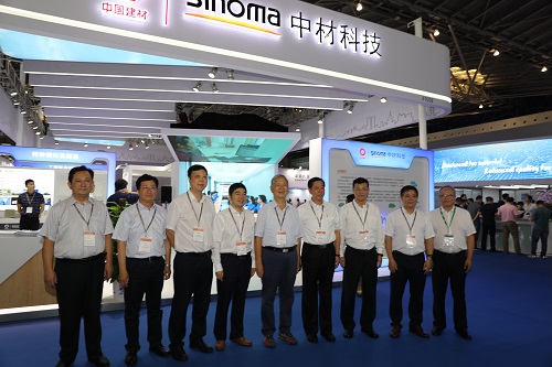 展会开幕后,建材联合会荣誉会长张人为、中国建材集团副董事长、党委常委李新华,中国建材股份副总裁、中复集团董事长、党委书记、总经理刘标一行参观公司展台,公司薛忠民、宋伯庐、赵谦、赵俊山、吴龙、郭伟等相关领导陪同参观。